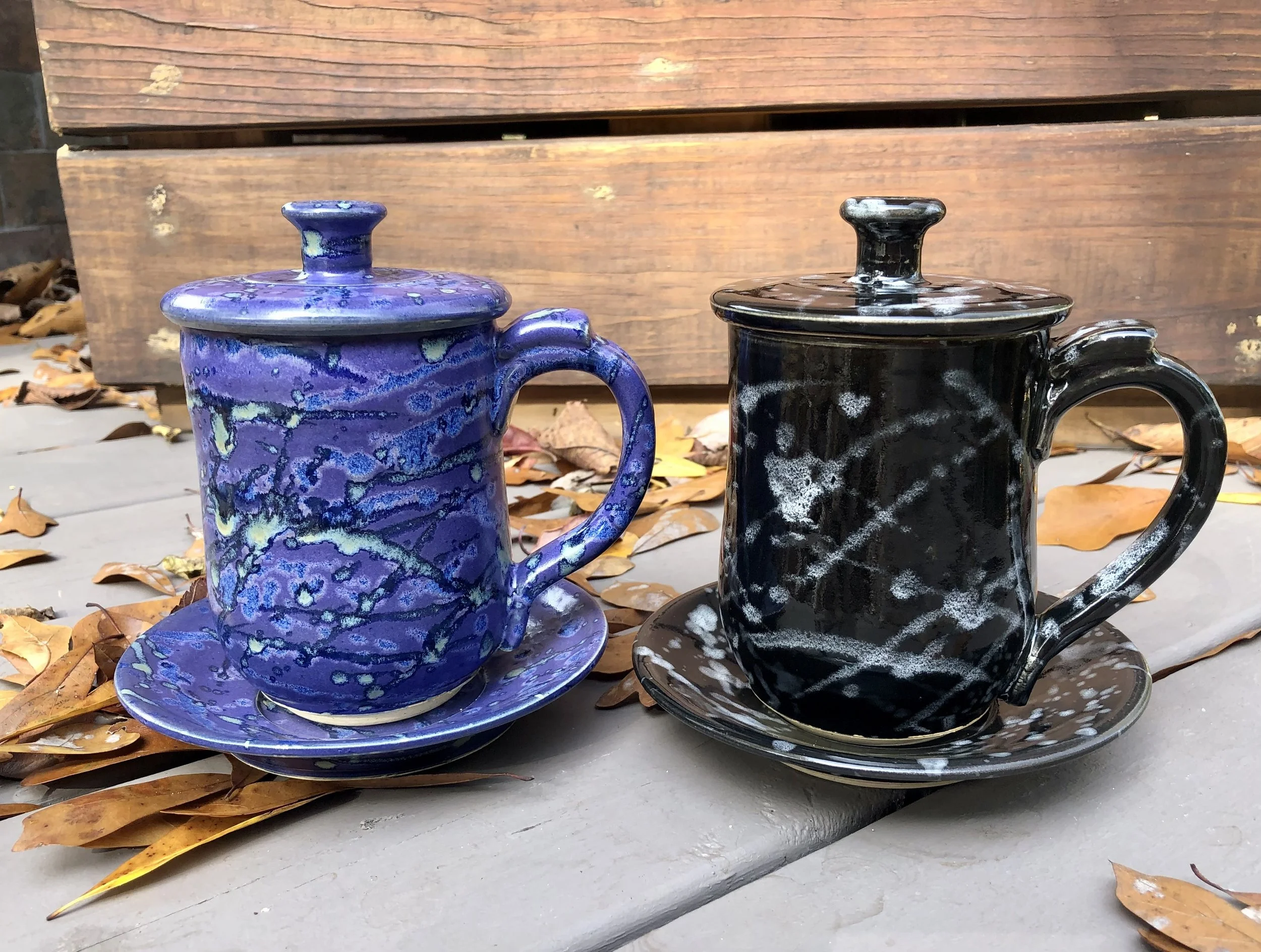 I believe that functional pieces should be beautiful, and I do my best to make them that way. I work mostly on the potter's wheel with beautiful porcelain, decorated with underglaze designs and then fired with a clear glaze, but I also use different types of stoneware to make pieces like this one of lidded mugs, where colorful glazes are accented, to create fun and unpredictable designs.