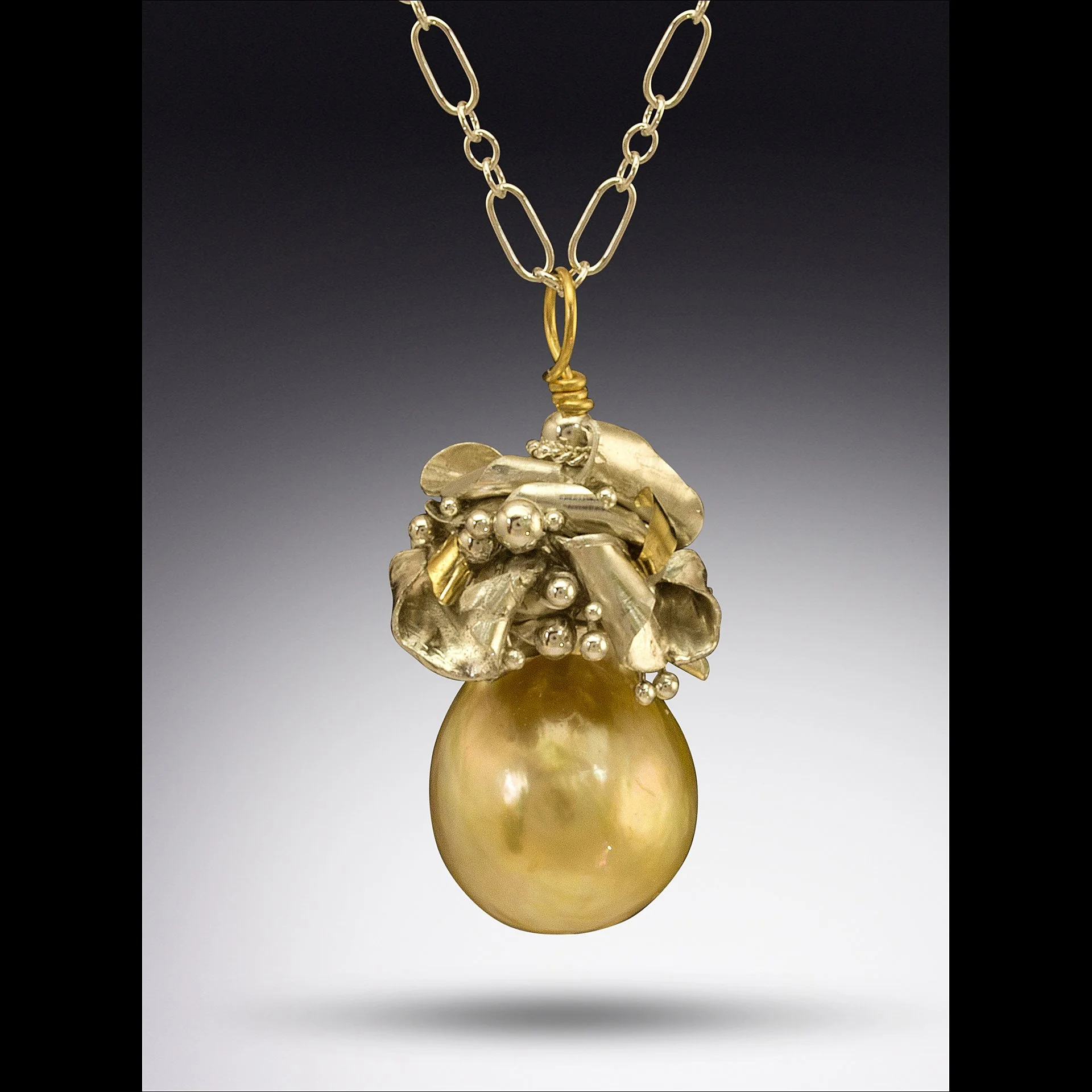 Starting with a sheet of Fine Silver or 18K Gold, she cuts out a shape to work with and begins hammering and forming it into a cap, setting or decoration. Sterling, Fine Silver and 18K Gold wire are also used to make flourishes, boules, bails and chain.